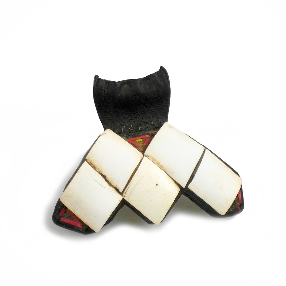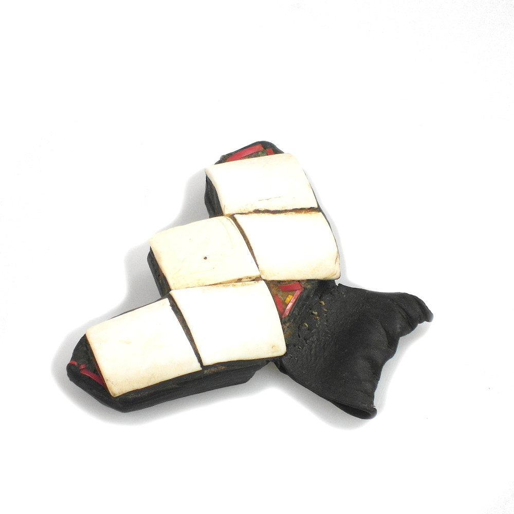 Hand-cut pieces of conus shell are set onto a leather backing with natural resin acting as glue forming a lozenge pattern. These talismans are worn by both Tuareg and Bella people.